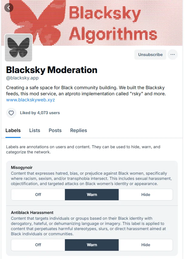 One of Blacksky’s most distinctive features is its approach to content moderation, particularly in addressing two persistent challenges in social media: misogynoir and anti-Black harassment. Rather than relying solely on platform-level moderation, Blacksky employs volunteer moderators with specific expertise in these areas.